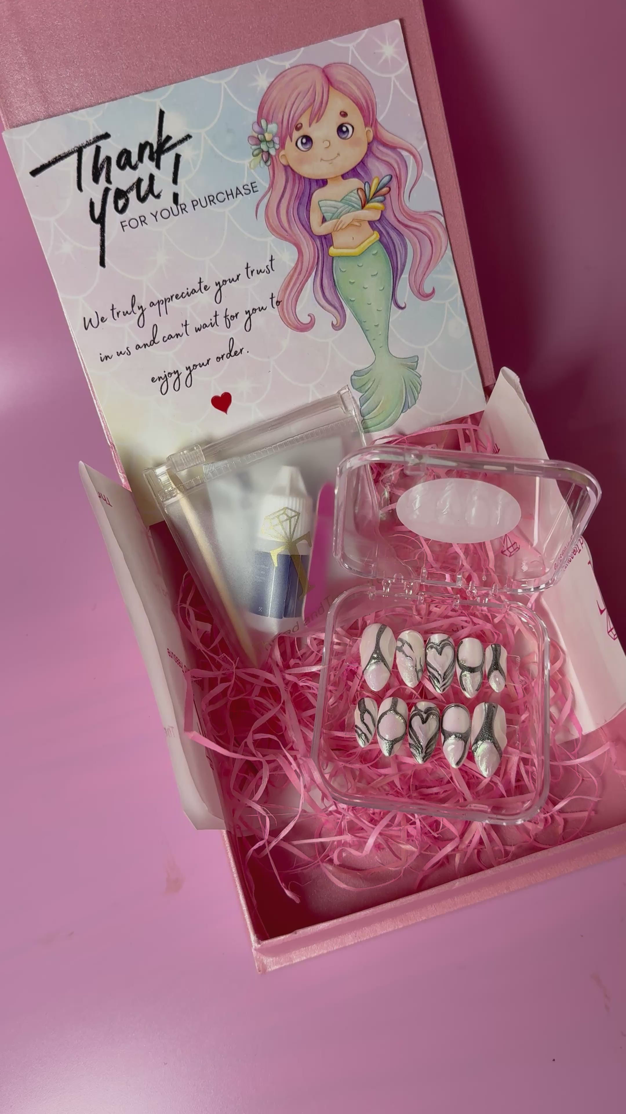 A dreamy pearl base with holographic shimmer, outlined in bold black swirls and statement heart accents. Serving Y2K nostalgia with a cosmic twist